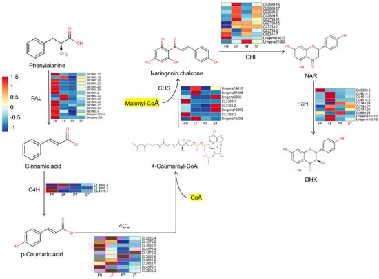 The DHK biosynthesis pathway begins with L-phenylalanine, which is catalyzed by phenylpropanoid-related core biosynthesis genes phenylalanine ammonia-lyase (PAL), cinnamic-4-hydroxylase (C4H), and 4-coumaryl-CoA ligase (4CL), which is a precursor for the biosynthesis of all phenolic secondary metabolites in higher plants. Coumaryl-CoA and malonyl-CoA are catalyzed by chalcone synthase (CHS) to form chalcone, followed by the isomerization of chalcone isomerase (CHI) to form Naringenin (NAR), an important backbone of flavonoids. DHK is subsequently generated by NAR catalyzed by Flavanone-3-hydroxylase (F3H). In this study, a total of 57 single genes belonging to the DHK biosynthesis pathway were identified in combination with transcriptome data from Trapa bispinosa Roxb., and the expression levels of the genes were shown with heat maps (Figure 1).