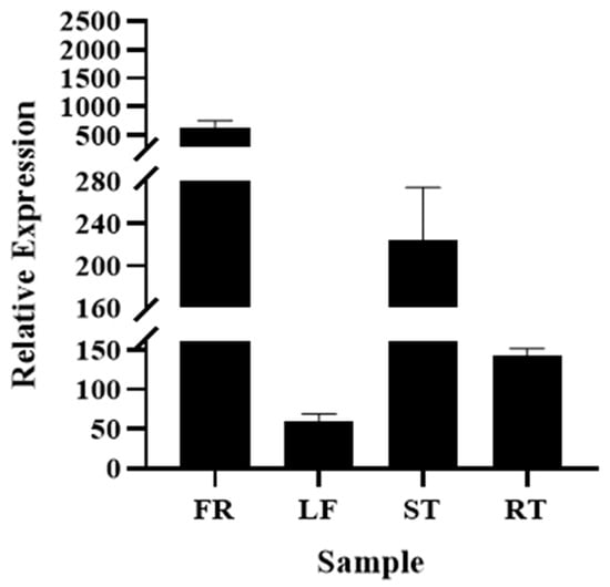 Quantitative real-time PCR (qRT-PCR) was used to detect the expression level of the TbF3H gene in four tissues: shell (FR), leaf (LF), stem (ST), and root (RT) (Figure 2). Apparent differences in transcription levels were observed in different parts, the highest being FR expression, and ST expression being the second highest. In contrast, the RT and LF yielded relatively low expressions.