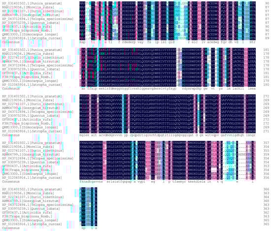 In the homology analysis of the TbF3H protein sequence, the compared species included Punica granatum, Morella rubra, Durio zibethinus, Gossypium hirsutum, Telopea speciosissima, Quercus lobata, Actinidia rufa, Dimocarpus longan, and Jatropha curcas. The results showed a similarity of 91.21% between the protein and the compared sequence (Figure 5).