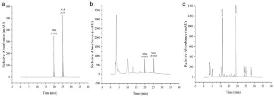 Determination of recombinant F3H enzyme activity using HPLC. (a) NAR and DHK standard; (b) DHK experimental group; and (c) black group.