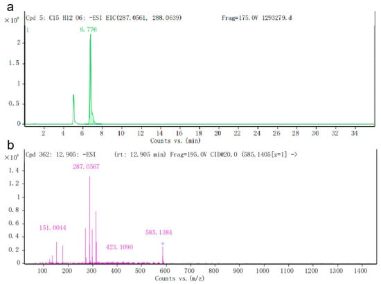 To further determine the product catalyzed by the TbF3H protein in yeast fermentation, Liquid Chromatography–Mass Spectrometry (LC-MS) was used to detect the product composition in the fermentation samples (Figure 9). The mass spectrometry results showed the presence of DHK characteristic ion fragments in the fermentation sample with m/z of 287.0578. The molecular formula of the sample was consistent with that of the DHK standard, which was C15H12O6, and the results were in agreement with the negative ion scanning results of the standard.