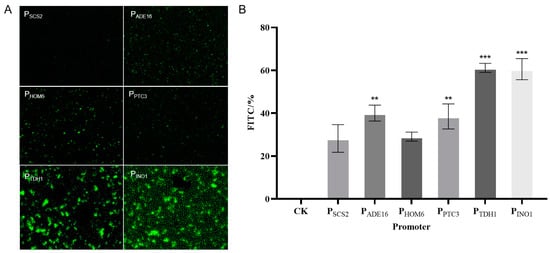 The expression of EGFP was detected by a fluorescent inverted microscope as a way to verify promoter expression (Figure 10A). The transcription activity of six promoters was verified on the basis of EGFP fluorescence strength by a flow cytometer. The mean values of fluorescence intensity were used to represent promoter transcription activity. An ideal promoter should have strong EGFP fluorescence intensity. The transcription activities of the six promoters were compared using the EGFP-free vector as a blank control (Figure 10B). The results showed that PTDH1 and PINO1 were strong constitutive promoters, as detected by flow cytometry and fluorescence microscopy.