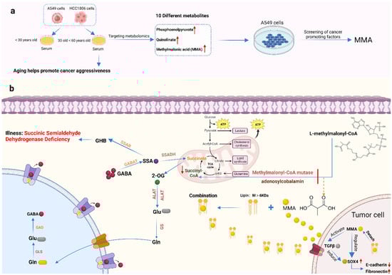 Metabolomics for biomarker discovery and therapeutic target identification. Pathogenesis of disease based on regulation of metabolites in the tricarboxylic acid cycle. (a) Targeted cancer promotion experiment on the metabolites showed that methylmalonic acid (MMA) was the main cancer-promoting factor in aging serum. (b) Cancer-promoting mechanism of MMA found that MMA is produced when the conversion of L-methylmalonyl-CoA to Succinyl-CoA is abnormal. MMA is difficult to transmembrane itself and binds with lipoproteins (>6 kDa) to transmembrane into cancer cells. The figure was created by BioRender (https://app.biorender.com/).