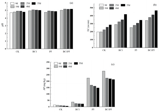 | Biochar | pH | Ash * (%) | EC (ms/cm) | Water-Soluble Phosphorus (mg/kg) | Specific Surface Area (m2/g) | Total Pore Volume (cm3/g) |