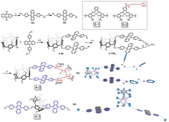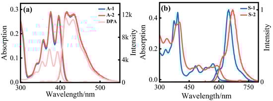 Supramolecular assembly presents an excellent strategy to precisely arrange and control the orientation of molecules [39,40,41,42,43,44,45]. Previously, we have demonstrated that chemically tuning the structures of sensitizers, as well as the host–guest complexation, could significantly facilitate the TTET process [46,47], and, by carefully regulating the aggregation state of the annihilator, the TTA process was selectively manipulated without disturbing the TTET process [48,49]. Moreover, by self-assembling the annihilators on the edge of an inorganic clay nanosheet through electrostatic attraction, a UC quantum yield (ΦUC) record in the solid state was achieved [50]. These results demonstrated that, in addition to the photophysical properties of the UC components, the orientation of molecules also had an important effect on the TTA-UC efficiencies. Thus, herein, we designed two novel supramolecular annihilators, A-1 and A-2, to confirm the important effect of the molecular orientation on the TTA process. It was found that, along with the facilitated TTET and TTA process, due to the close proximity of the sensitizer and annihilator, the parallel orientation of the DPA units in A-2 greatly enhanced the TTA process, with UC quantum yield enhanced from 5.1% for A-1 to 13.7% for A-2.
