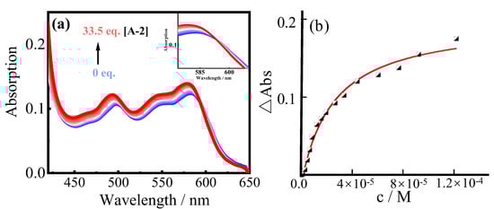 (a) UV–vis absorption spectra of the complexes S-2⊂A-2 with different molar ratios in CHCl3 at 25 °C, [S-2] = 2.0 × 10−5 M, [A-2] = 0–0.67 mM (inset: zoomed-in view of the isoabsorptive point). (b) The non-linear curve-fitting (UV–vis titrations) for the complexation of A-2 with S-2 (2.0 × 10−5 M) in CHCl3 at 25°C; the association constant (Ka) was 3.6 (±0.3) × 104 M−1. The function used to fit the data: y = 0.5 (△ε2x+ [G0] + 1/Ka) − (△ε2(x + [G0] + 1/Ka)2 − 4△ε[G0]x)0.5, △ε: difference in the molar extinction coefficient of the host before and after coordination; y: △Abs; x: concentration of the host; [G0]: concentration of the guest; Ka: the association constant.