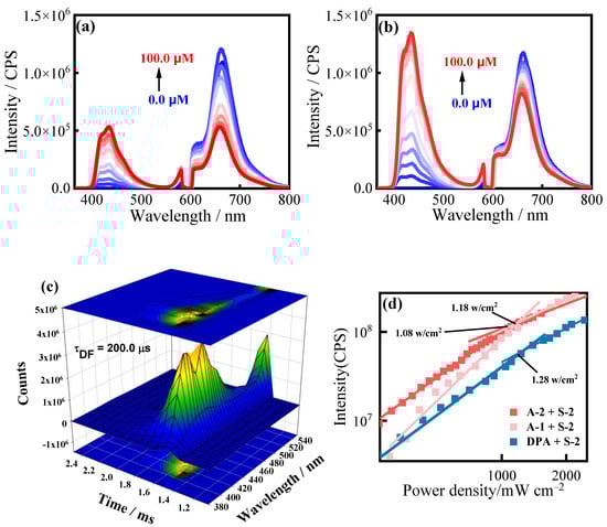 Emission spectra of the UC systems with S-2 as the sensitizer and different concentrations of A-1 (a) and A-2 (b) as the annihilator. [S-2] = 5 μM, [annihilators] = 0.0 μM to 100.0 μM in de-aerated toluene, excited with a 589 nm laser (5.2 mW); (c) Time-resolved emission spectra (TRES) of the upconverted fluorescence of A-2 using S-2 as the photosensitizer. [S-2] = 5 μM, [A-2] = 25 μM. The change in color from blue to green to yellow represents the change in the number of photons at different wavelengths over time. (d) The UC intensity of UC systems S-2/A-1, S-2/A-2, and S-2/DPA, plotted as a function of incident light power. [S-2] = 5 μM, [annihilators] = 25 μM in toluene.