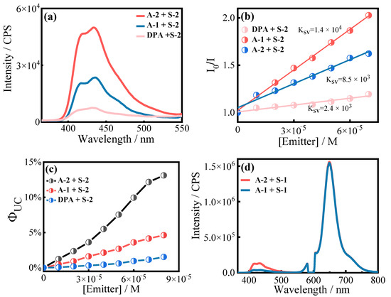 Indeed, the UC emissions of both A-1 and A-2 when S-2 was the sensitizer were much higher than that of DPA (Figure 4a), which was as expected, as the TTET process should be significantly facilitated by the host–guest interactions in A-1 and A-2 [46]. To prove this, the TTET processes were investigated based on the variation in phosphorescence intensity of S-2 with changes in the concentration of the annihilators. Increasing the concentration of A-1, A-2, and DPA led to a progressive decrease in phosphorescence intensity, and the Stern–Volmer analysis of the phosphorescence quenching data showed an approximately linear relationship (Figure 4b). The KSV values, when A-1 and A-2 were the acceptors, were indeed much higher than that of DPA, demonstrating that the TTET processes were facilitated by the host–guest interactions, which led to higher UC emissions.