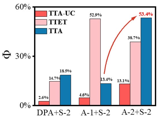 Histogram of ΦUC, ΦTTET, and ΦTTA of the UC systems with S-2 as the sensitizer and A-1, A-2, and DPA as the annihilator. [S-2] = 5 μM, [A-1] = 80 μM, [A-2] = 80 μM, and [DPA] = 160 μM in toluene, the red arrow was used to show the increasement of ΦTTA.