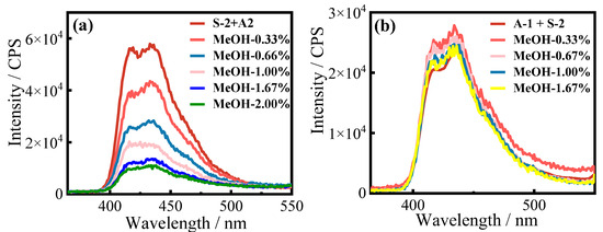 (a) UC emission spectra of UC systems A-2/S-2 (a) and A-1/S-2 (b) in de-aerated toluene with different concentrations of MeOH. [S-2] = 5 μM, [A-1, A-2] = 25 μM.
