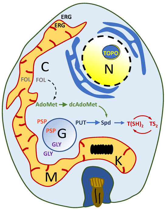 Schematic representation of a trypanosomatid amastigote. The main metabolic pathways that have been considered as potential drug targets are indicated in different colors: polyamine metabolism (blue color); methyl cycle metabolism (green color); modification of the topological state of DNA (yellow color); redox metabolism (red color); sterol biosyntyhesis (black color); folate metabolism (purple color); purine salvage pathway (orange color); folate metabolism (gray color). Abbreviations: AdoMet: S-adenosylmethionine; C: cytosol; dcAdoMet: decarboxylated AdoMet; ERG: ergosterol; FOL: folate; G: glycosome; GLY: glycolysis; K: kinetoplast; M: mitochondrion; N: nucleus; PUT: putrescine; PSP: purine salvage pathway; Spd: spermidine; TOP: DNA topoisomerase; T(SH)2: reduced trypanothione; TS2: oxidized trypanothione.