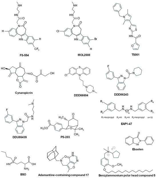 Buthionine sulfoximine (BSO) (Figure 7), the potent inhibitor of γ-glutamylcysteine synthetase [155], was found to partially inhibit recombinant TryS, likely due to the binding of BSO at the glutathione site, and it showed mainly cytostatic effects, thereby suggesting the synthesis of BSO analogs with improved inhibitory effects [156].