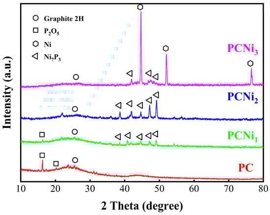 XRD patterns of PC, PCNi1, PCNi2, and PCNi3 can be seen as red, green, blue, and pink line accordingly.