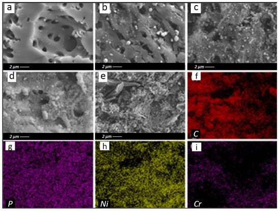 The superficial or surface morphology and fundamental components of the elemental properties of PC, PCNi, and PCNi-Cr were investigated by FESEM and the equipped EDS mapping methods. After H3PO4 activation, the PC presented a three-dimensional honeycomb-like structure and an irregular porous structure consisting of many well-developed porosities (Figure 2a), which could provide it with a remarkably huge specific surface area and an abundance of surface active sites, thereby improving the Cr (VI) adsorption performance remarkably. This indicates that H3PO4 activation has a major consequence for the microstructure of chestnut shell-based biochar. After the treatment of Ni doping, the surface of PCNi gradually showed a trend of roughness, and numerous particles as well as cotton-like substances were found on the surface pores of PCNi (Figure 2a–d). Moreover, as the nickel content increased, the cotton-like substances became more apparent. In PCNi3, we could observe that its entire surface was covered by a layer of reticulate cotton-like material (Figure 2d). Combining these results with the XRD results, it was speculated that these particles and cotton-like substances should be the metallic-state Ni0 and Ni7P3 formed during the annealing process. Although this Ni-containing matter can block some surface pores of biochar and deteriorate its specific surface area and porous structure, the existence of Ni0 and Ni7P3 is believed to be beneficial for attracting Cr (VI) ions through electrostatic interaction, thus promoting their anchoring on the surface of the adsorbent. However, the network cotton-like structure basically disappeared and some flocculent condensates were observed on the top layer of PCNi-Cr after Cr (VI) adsorption (Figure 2e). This may be ascribed to the collaboration between Cr (VI) ions and Ni0, Ni7P3, and the related functional groups on its surface. Figure 2f–i show the distribution of C, P, and Ni elements in PCNi3 and Cr elements in biochar post the adsorption action of Cr (VI). The elemental compositions of the developed biochars are listed in Table S1. It can be seen that C, P, and Ni are uniformly distributed on the surface of PCNi3. In addition, the existence of Cr on the top layer of PCNi-Cr confirms that PCNi3 can effectively adsorb Cr (VI) ions from water. The FESEM and EDS results prove that the H3PO4 activation and Ni doping approach can effectively promote the formation of a porous structure in chestnut shell-based biochar, which may possibly have a more efficient outcome in terms of the adsorption of Cr (VI) from water.