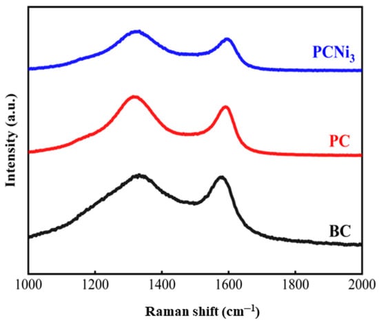 In order to investigate the graphitization state of the prepared biochar, Raman spectra of BC (biochar), PC, and PCNi3 were obtained and are shown in Figure 3. The obvious characteristic peaks can be observed at ~1322 and ~1592 cm−1 in the spectra of all biochar samples, corresponding to the D and G peaks for carbon materials [22]. The D peak represents the sp3 hybridization of carbon atoms, disordered vibration of carbon atoms, and defects of carbon atoms, while the G peak can be ascribed to the in-plane telescopic vibration of sp2 hybridization of carbon atoms [23,24]. It can be assumed that the D peak represents the relative content of defective carbon and the G peak reflects the relative content of graphitized carbon in the biochar [24]. Therefore, the ratios between D and G peaks (Id/Ig), which reflect the acuteness of defects and disorders in the carbon structure of biochar, can be calculated to be 1.23, 1.40, and 1.46, respectively. The higher values for Id/Ig indicate that the as-prepared PCNi3 treated by H3PO4 activation and nickel doping had more defects, an enriched pore structure, and a higher degree of disorder than BC and PC, which could endow PCNi3 with abundant active sites conducive to the adsorption of Cr (VI) [25].