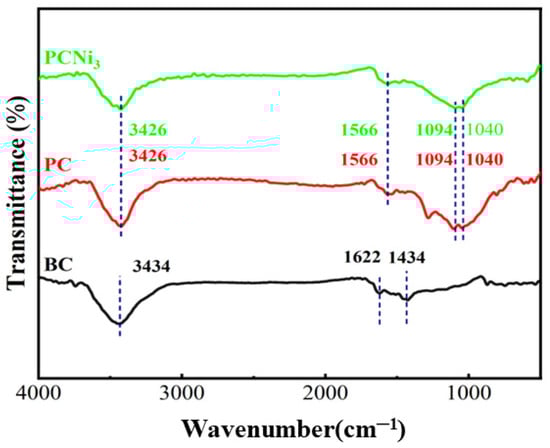 The surface chemical functional groups of the BC, PC, and PCNi3 were characterized using FTIR spectra, and the results are displayed in Figure 4. The distinct peak characteristics at 3434, 1622, and 1434 cm−1 for BC are correlated with C-O bonds, and some stretching can be noticed due to the aromatic rings of C=O, C=C groups, which can be seen in the structure of lignin as well as in O-H bonds [21]. After H3PO4 activation and nickel doping, the absorption peaks of PC and PCNi3 were shifted and some new peaks appeared at 3426, 1566, 1094, and 1040 cm−1, which could have been an effect of -OH groups, aromatic C=C structural vibration, phenolic hydroxyl O-H deformation, C-O stretching vibration, O-H distortion of alcohol or ether groups, C-O elongating vibrations, etc. [26,27]. The shifts in the peaks representing the character and appearance of functional groups on the top layer imply that the enhancement of oxygenated reactive groups in PC and PCNi3 provided abundant surface active sites for the adsorption of Cr (VI) from water and thus enhanced the potential for binding between biochar and Cr (VI) [28].
