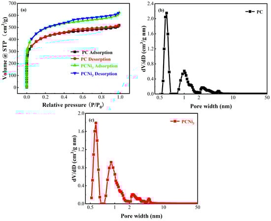 Secondly, the appearance of Ni0 after nickel doping can be attributed to the reduction of nickel by carbon. The gas released during this process leads to the creation of abundant micropores in the biochar outer layer [48]. The related reactions are illustrated in Equations (3)–(5).