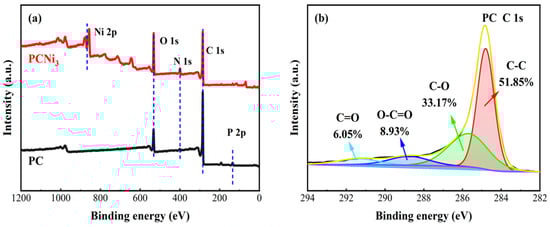 Figure 5 shows the adsorption/desorption as well as the pore-size distribution plots for PC and PCNi3. As Figure 5a shows, the curves of all the samples show typical type IV features in the IUPAC classification and H4 hysteresis loop characteristics. The curves rise in the low-pressure part and present an upward, slightly convex shape, which is attributed to the condensation of N2 molecules with the gas molecules on the pre-adsorbed layer, indicating the existence of a porous hierarchical structure in the as-prepared biochar [29]. Furthermore, all samples exhibit a rapid rise in the isotherms at the low-pressure end and hysteresis loop presence, implying the existence of more micropores [30]. From the pore-size distribution plots (Figure 5b), the pore-size distribution of PC is mainly concentrated in the range of 0.5~3.0 nm. However, the pore-size distribution of PCNi3 does not change much compared to PC (Figure 5c), implying that Ni7P3 formed during nickel loading does not cause large-scale pore clogging of biochar. According to the parameters regarding the pore structures of PC and PCNi3 listed in Table S2, compared to PC, the specific surface area of PCNi3 increases from 1521.55 to 1775.94 m2·g−1, the average pore size increases from 2.11 nm to 2.18 nm, and the total pore volume surges from 0.80 to 0.97 cm3·g−1. Notably, the microporous area of PCNi3 is 1235.85 m2·g−1, which accounts for 69.59%, which is ascribed to the fact that the gas molecules released during the reduction of doped nickel by carbon produce more micropores as they escape from the surface of biochar. All in all, the PCNi3 has a reasonable pore structure and pore-size distribution which is a combination of a high specific surface region and a remarkable microporous structure, such that PCNi3 contains more active sites, which promotes attraction between PCNi3 and Cr (VI), making it an ideal adsorbent.