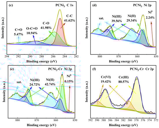 XPS spectra of biochar: (a) XPS full spectra of PC and PCNi3, (b,c) C 1s of PC and PCNi3, (d,e) Ni 2p of PCNi3 and PCNi3-Cr, and (f) Cr 2p of PCNi3-Cr.