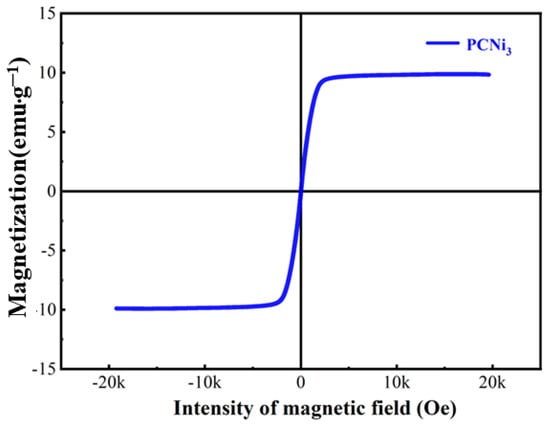 The magnetic field-dependent magnetization (M-H) illustrated in Figure 7 represents loops in a range of ±2 T at room temperature of PCNi3. The remnant and spontaneous magnetization are 0.15 and 9.88 emu·g−1, respectively. When the external magnetic field is removed, PCNi3 has almost no remnant magnetization and the area of hysteresis loop closure tends to zero, revealing superparamagnetic characteristics at room temperature. This indicates that PCNi3 possesses solid–liquid separation and recycling performance under magnetic field application.