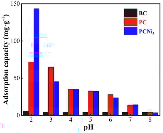 The initial pH of a solution is an important factor which affects the Cr (VI) adsorption capacity of biochar. The solution pH not only determines chromium’s state in the reaction solution but also can affect the surface functional group distribution states of biochar [35]. As displayed in Figure 8, a higher initial solution pH leads to a weaker Cr (VI) adsorption capacity of biochar. This is because in an acidic environment (pH less than 6.0), the biochar surface can be charged positively by combining with more H+, which in turn promotes the adsorption performance of negatively charged Cr (VI) in the form of anions which contain oxygen [36]; when the pH rises, the OH− which become more numerous as a consequence will compete for active sites with anionic groups containing Cr (VI), thereby inhibiting the removal of Cr (VI) [35]. The best removal performance with respect to Cr (VI) was observed in PCNi3 (up to 143.51 mg·g−1) when the solution pH was 2.0. Furthermore, PCNi3 is more influenced by the initial solution pH compared to PC. One possible explanation is that biochar treated by H3PO4 activation mainly relies on its remarkable porous microstructure and surface functional units for adsorbing Cr (VI), whereas the nickel-doped modified biochar also suffers from the mutual attraction and redox effect between Ni0 particles or nickel-based compounds on the surface and Cr (VI), and its performance is much more sensitive to the change in H+ in solution. The subsequent batch experiments in this paper were carried out under an acidic environment in which the initial solution pH was 2.0.
