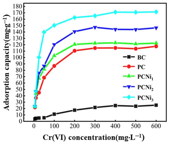 The primary concentration of a solution is also one of the important parameters affecting the effectiveness of the adsorption process. Figure 9 illustrates the performance of BC, PC, and PCNi in removing Cr (VI) from water under changed initial Cr (VI) concentrations (5~600 mg·L−1). With the increment in the initial concentration from 5 to 600 mg·L−1, the adsorption of Cr (VI) by modified biochar Cr (VI) firstly increases sharply and then slows down until reaching the adsorption equilibrium. This phenomenon is a result of the fact that when Cr (VI) ions increase in the solution, the limited active regions of the top layer of the biochar are progressively exhausted to reach adsorption saturation [37]. Notably, the adsorption performance of PC and PCNi is much higher than that of BC, indicating that the treatments of H3PO4 activation and nickel doping have significant modification effects on biochar. In addition, the high content of nickel doping is favorable to the enhancement of the adsorption efficiency of PCNi, which is the result of change in the surface functional groups caused by nickel doping, the strong attraction of surface nickel to Cr (VI), and the high charge mobility rate of Ni7P3. When the initial solution concentration of Cr (VI) is 600 mg·L−1, the PCNi3 sample has the highest adsorption efficiency, reaching up to 171.43 mg·g−1. The variation in the adsorption efficiency of biochar in the initial solution concentrations of Cr (VI) reflects the results of the competition between the amount of Cr (VI) present in the solution and the number of functional groups and active sites on the external layer of the biochar.