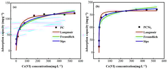 Adsorption isothermal model fitting curves for Cr (VI) using (a) PC and (b) PCNi3 (basic conditions: pH = 2.0; V = 100 mL; tcontact = 1440 min; T = 298 K).
