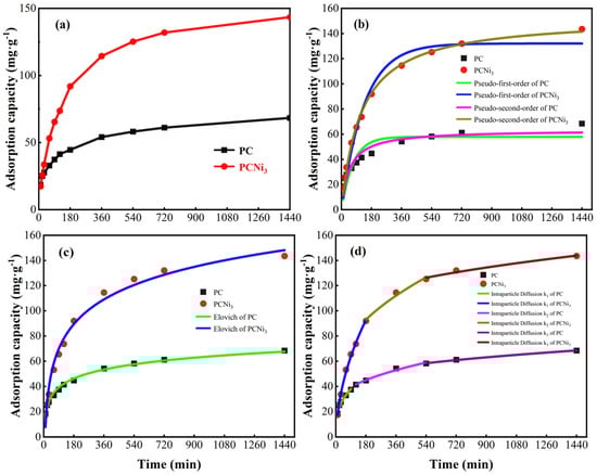 To study the adsorption of Cr (VI) onto biochar, the adsorption capacities vs. reaction time curves for PC and PCNi3 were determined (Figure 11a). Evidently, the adsorption efficiency of biochar with respect to Cr (VI) increases rapidly with the increase in the reaction time in the initial stage of 180 min. The adsorption increases only gradually until the reaction reaches the equilibrium point. Taking PCNi3 as an example, its unique porous microstructure, including rich active sites and surface functional groups, can capture Cr (VI) in the preliminary stage of the adsorption process easily. The Cr (VI) ions diffuse rapidly on the surface of the biochar and gradually occupy those active sites [44]. With the increase in reaction time, pores on the surface of PCNi3 will be filled, the active sites occupied, and the surface functional groups gradually consumed. Consequently, when the equilibrium is reached, the adsorption efficiency tends to stabilize. At this time, the adsorption capacity of PCNi3 reaches 143.51 mg·g−1 at its highest.