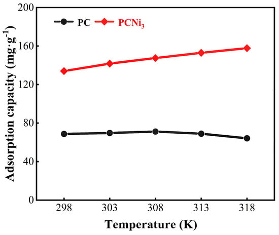 To study the spontaneity of adsorption reactions, the adsorption behaviors of the biochar with respect to Cr (VI) were analyzed at various temperatures through adsorption thermodynamics. As demonstrated in Figure 12, the Cr (VI) removal performances of PC and PCNi3 at different temperatures, i.e., 298 K, 303 K, 308 K, 313 K, and 318 K, were tested. The Cr (VI) adsorption capacity of PC increases and then falls with the increment in temperature. One possible reason is that when the adsorption equilibrium is reached, the continuously rising temperature increases the entropy of the environmental system and the tendency of active Cr (VI) on the surface of PC increases until it acquires enough energy to be desorbed [38]. Compared with PC, the efficiency of adsorption of Cr (VI) by PCNi3 develops with the increase in temperature because the adsorption procedure does not reach equilibrium, and the increase in temperature prompts Cr (VI) ions to move more vigorously in solution, which raises the chances of contact between them and the active sites of biochar [38]. Meanwhile, the rising temperature can also effectively promote the diffusion of particles, which is conducive to the adsorption performance of biochar.