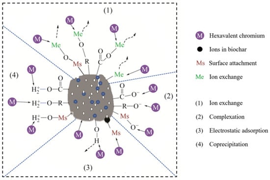 Finally, the chemisorption also works on the principle of sharing and transferring electron pairs between biochar and Cr (VI), with Ni7P3 acting as a high-charge-mobility electron donor during the absorption process, which is marked as (1) ion exchange in Figure 13. Most of the Cr (VI) (more than 80%) will be reduced to Cr (III) with the assistance of redox action. Meanwhile, the formation of Cr (III)-based precipitation and complexes is due to the (2) complexation and coprecipitation (4) process, as shown in Figure 13.