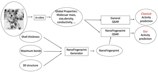 Some QSAR models have been reported for the prediction of the toxicity of metal oxide nanocompounds [13]. In this section, we show the usability of NanoFingerprints for toxicity prediction by defining new QSARs. The main idea is to increase the data used to compute the prediction in other QSAR models, such as the ones in [5,6], and, in doing so, increase the accuracy of these predictions. Figure 1 exemplifies a general method used to predict the activity of a nanocompound based on a classical QSAR model (top) and our NanoFingerprint model (bottom). Note that we use properties extracted from the in vitro process and also properties extracted from the theoretical structure of the nanocompound. Rectangles represent processes or models, and circles represent data.