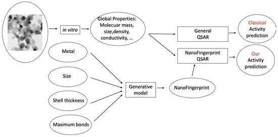 Figure 3 shows the process of learning the QSAR based on a classical model (up) and based on a generative model (down). It is similar to Figure 1, but the NanoFingerprint generator has been substituted with the generative model. Note that, in this case, the generation of the three-dimensional structure is not needed, and instead, a generative model is used.