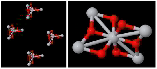 Figure 5. (left) Visualisation of the four appearances of TiO2 of 06A in the shell (thickness 4A) of TiO2 of 2 nm (Figure 4). (right) TiO2 of 06A.