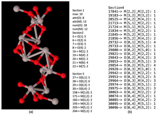 (a) Chemical nanocompound Al2O3 with a size of 13 Angstroms. Oxygen atoms in red and aluminium atoms in grey. (b) NanoFingerprint of chemical nanocompound Al2O3 with a size of 13 Angstroms. The first element of the NanoFingerprint concerns the maximum number of edges (10). The next two elements of the GraphFingerprint concern the elements being oxygen (atomic number: 8) and aluminium (atomic number: 13). Only the positions of the vector with a non-null value were selected. The positions appear at the beginning of each line.