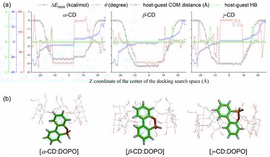 The center of the docking space was set to (0, 0, z), and z changed from −25 to 25 Å. As expected, [host:guest] COM distances changed from negative values to positive ones with the increasing z, as presented in Figure 2a. A negative distance indicates that the COM of the guest was much closer to the secondary rim (S-rim) of CDs than the primary rim (P-rim), and a positive distance means that the COM of the guest was close to the P-rim (for instance, Figure 1a). As z increased, the binding affinity (∆Edock) between host and guest started to increase, then reached a plateau, and finally decreased (Figure 2a). This implies that the guest DOPO was inserted into the CD cavity step by step, and then escaped from the cavity. At both ends of binding affinity profiles (Figure 2a), host and guest molecules were completely separated, and there was no interaction between them; the docking prediction gave a ∆Edock of zero. The central plateau of binding affinity profiles correspond to the formed [host:guest] inclusion complexes. The plateau covered a range of ca. [−10, 10] Å because the box length of the docking search space was 20 Å and the height of the CD cone was 7.9 ± 1.0 Å [48]. In other words, if the search space covered the whole CD molecule, regardless of the given searching center, one could predict almost identical binding poses of the binding partners, as indicated by a significant span for the central plateau in Figure 2. Outside the central plateau, the guest did not penetrate into the CD cavity and was located outside the cavity in most cases, as indicated by the more positive ∆Edock and an arbitrary guest orientation (θ) relative to CDs (Figure 2a).