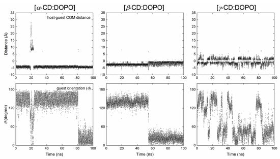 The center of mass (COM) distance between host and guest (top) and guest orientation (bottom) for the complexes of α-CD (left), β-CD (middle), and γ-CD (right) with DOPO as a function of simulation time using the BP binding mode (Figure 1a) as an initial configuration. Refer to the caption of Figure 3 for the meaning of positive and negative values for the [host:guest] distances.