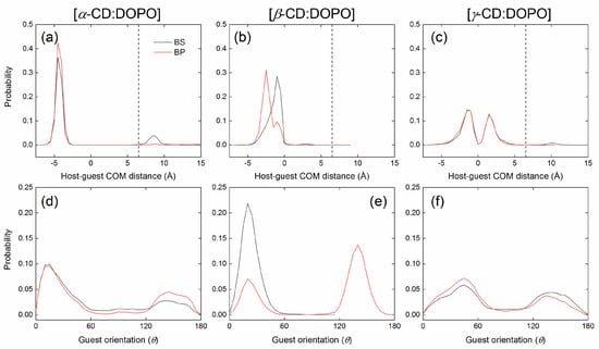 Distribution of the center of mass (COM) distance between host and guest (top, a–c) and guest orientation relative to host (bottom, d–f) for the complexes of α-CD (left), β-CD (middle), and γ-CD (right) with DOPO during MD simulations using BS and BP binding modes (Figure 1a) as initial configurations. The dash lines indicate a distance of 6.5 Å, which separates the binding pose of the guest included in the CD cavity from the pose of the guest located outside the CD cavity. Each system was simulated for 100 ns and repeated three times using different initial velocities. Refer to the caption of Figure 3 for the meaning of positive and negative values for the [host:guest] distances.