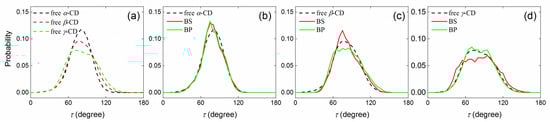 Distribution of the tilt angle (τ) of the glucose units during MD simulations of the free (isolated) hosts (a) and [host:guest] inclusion complexes for α-CD (b), β-CD (c), and γ-CD (d). The dashed lines indicate the systems of free CDs, and the solid lines are for the inclusion complexes of CDs with DOPO in the binding modes of BS and BP.