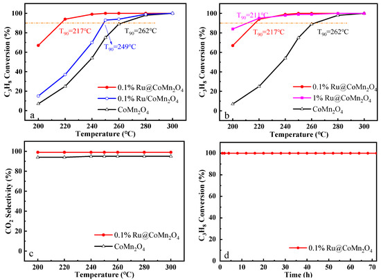Effects of (a) different Ru loading methods and (b) loading content on catalytic activity of propane; (c) CO2 selectivity of catalysts (reaction conditions: 0.2 vol% C3H8, 10 vol% O2, N2 as balance gas, and GHSV = 60,000 mL g·cat−1 h−1); (d) stability of 0.1%Ru@CoMn2O4 catalyst (reaction conditions: 0.2 vol% C3H8, 10 vol% O2, N2 as balance gas, GHSV = 60,000 mL g·cat−1 h−1, and 250 °C).