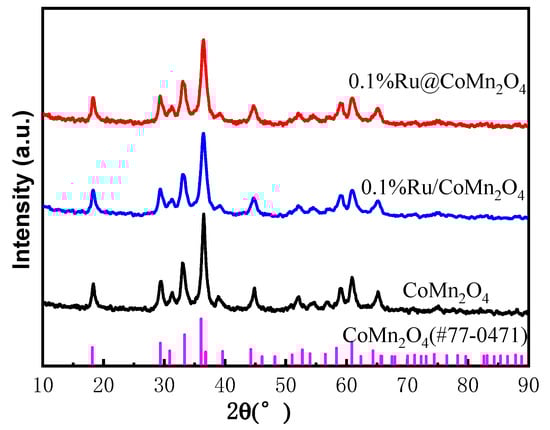 XRD was used to determine the crystal structure of the spinel catalysts. The wide-angle XRD spectra of the samples are shown in Figure 2. It can be seen that the peak positions of 0.1%Ru@CoMn2O4, 0.1%Ru/CoMn2O4, and CoMn2O4 were basically the same as those of the standard card (JCPDS No. 77-0471) of CoMn2O4. These results suggest that the acetates of cobalt and manganese were decomposed at high temperatures into metal oxides and formed spinel catalysts by complete phase transitions, rather than simple mixtures of metal oxides. Specifically, the diffraction peaks situated at 18.2°, 29.2°, 31.2°, 33.0°, 36.3°, 44.8°, 59.0°, 60.9°, and 65.2° corresponded to the (101), (112), (200), (103), (211), (220), (321), (224), and (400) crystal planes of the CoMn2O4 spinel structure [34]. No diffraction peak of the Ru species was detected in 0.1%Ru@CoMn2O4 and 0.1%Ru/CoMn2O4, most likely due to the relatively low loading and uniform dispersal of Ru. In addition, the doping of Ru reduced the intensity of the diffraction peak, suggesting that the crystallinity decreased after Ru doping.