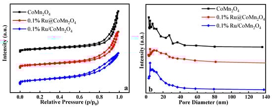 Figure 4 shows the nitrogen adsorption–desorption isotherms and the pore size distribution of the samples measured at 77 K. As can be seen from Figure 4, all of the samples exhibited typical type IV isotherms (IUPAC classification) with a separate H3 hysteresis loop, implying the formation of stacked pore structures. The abundant mesopores of the samples provided good diffusion conditions for the catalytic oxidation of propane [35]. The specific surface area, average pore size, and pore volume were calculated according to the classical BET and BJH models, and the structural parameters of the catalysts are summarized in Table 2. It can be seen that the surface area was obviously decreased after Ru doping, indicating that the introduction of the Ru species had a negative impact on the destruction of the textural structure. The surface area of 0.1%Ru@CoMn2O4 was smaller than that of 0.1%Ru/CoMn2O4, making it clear that the in situ introduction of Ru had a greater effect than the impregnation method. According to the activity evaluation results mentioned above, the physical properties were not the main factors affecting the activity of the catalyst.