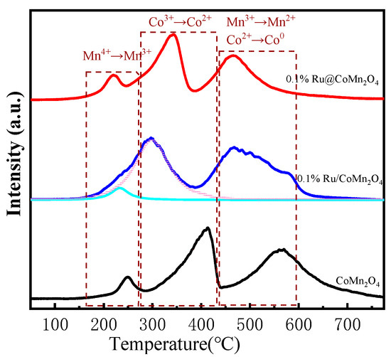 The redox capacity of the catalysts had a great impact on the catalytic activity for propane oxidation. The redox properties of the samples were investigated by H2-TPR, and the results are shown in Figure 5. Three reduction peaks can be observed in the H2-TPR curve of the CoMn2O4 catalyst. It contains four reduction processes. The peaks at 248 °C and 413 °C were attributed to the reduction of Mn4+→Mn3+ and of Co3+→Co2+, respectively. The peak at 565 °C contains two overlapped processes, including the reduction of Mn3+→Mn2+ and of Co2+→Co0 [36]. In contrast, the reduction peaks of 0.1% Ru@CoMn2O4 and 0.1%Ru/CoMn2O4 were obviously shifted in the low-temperature direction. Although the peak of Ru was not detected, the results sufficiently show that the doping of Ru significantly improved the low-temperature redox capacity of the catalyst. This may be owing to the stronger synergistic effect between the highly electronegative Ru and CoMn2O4; hence, the electrons were likely to migrate rapidly between them through the bridge oxygen structure. In addition, the reduction temperature of 0.1% Ru@CoMn2O4, especially for the shifting of Mn4+ to Mn3+, was lower than that of 0.1%Ru/CoMn2O4. Therefore, it can be concluded that the good low-temperature redox performance of 0.1% Ru@CoMn2O4 contributed to the acceleration of the catalytic oxidation cycle and improved propane oxidation activity to some extent.