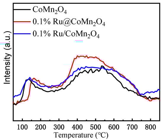 O2-TPD is an effective technique to study the desorption behavior of O2 on catalysts and is commonly used to evaluate the mobility and activation capacity of different oxygen species on catalysts. Typically, the capacity of oxygen desorption on the catalyst is O2(ad) > O2−(ad) > O−(ad) > O2−(lat) [37]. The adsorbed oxygen species (O2, O2−, and O−) are more readily desorbed than the lattice oxygen species [38]. Normally, oxygen species desorbed below 300 °C are physically/chemically adsorbed oxygen species on the catalyst surface, while oxygen species desorbed at higher temperatures (>300 °C) can be attributed to lattice oxygen. Based on the intensity of the oxygen desorption peaks (Figure 6), it can be seen that the content of lattice oxygen was 0.1%Ru@CoMn2O4 > 0.1%Ru/CoMn2O4 > CoMn2O4, and the temperature of the lattice oxygen desorption was shifted toward lower temperatures with the introduction of Ru, which suggests that Ru significantly enhanced the amount and mobility of lattice oxygen of the catalyst. It is possible that the highly electronegative Ru could promote the electron transfer from the cobalt–manganese spinel to Ru to form more lattice oxygen; at the same time, the doping of Ru caused the weakening of the bonding energies of Mn-O and Co-O, which increased the mobility of the lattice oxygens of CoMn2O4 and improved the catalytic oxidative performance of the lattice oxygen on propane [39,40,41,42]. In addition, the reduction temperature of 0.1% Ru@CoMn2O4, especially for the shifting of Mn4+ to Mn3+, was lower than that of 0.1%Ru/CoMn2O4. According to the results of H2-TPR and O2-TPD, it is concluded that the catalyst prepared by the in situ introduction of Ru had a better redox ability than that prepared by the impregnation method.
