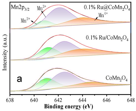 The surface state of the catalyst was analyzed by using the XPS technique to investigate the effect of cation substitution on the catalyst. Figure 7a demonstrates the high-resolution spectrum of Mn 2p3/2; the peaks at 640.8–641.0 eV, 642.0–642.4 eV, and 644.1–644.6 eV were attributed to Mn2+, Mn3+, and Mn4+, respectively [2,29,40]. The content of Mnn+ was calculated based on the fitted peak areas, and the results are summarized in Table 3. It can be observed that all of the samples were dominated by Mn3+. In addition, it is worth noting that the content of Mn4+ was significantly higher in the 0.1% Ru@CoMn2O4 catalyst compared with CoMn2O4. In the spinel structure, Mn preferentially occupied the octahedral coordination site as Mn3+. Partial Mn3+ cations were oxidized into Mn4+ in the octahedral sites due to the Jahn–Teller effect, which seriously distorted the localized lattice structure. As a result, the Mn-O bond energy became weaker, and the lattice oxygen easily participated in the reaction with propane [43,44]. It has been reported that the ratio of Mn4+/Mn is considered to have an important effect on the oxidation of VOCs, as the high-valence manganese species contribute to the oxidation of the catalysts [45]. Therefore, it was speculated that the doping of Ru, with the partial electron transfer from the lower electronegative Mn (X = 1.55) to the higher electronegative Ru (X = 2.20), elevated the valence of Mn at the octahedral sites, which contributed to the mobility of the lattice oxygen and facilitated the enhancement of the catalytic efficiency for propane.