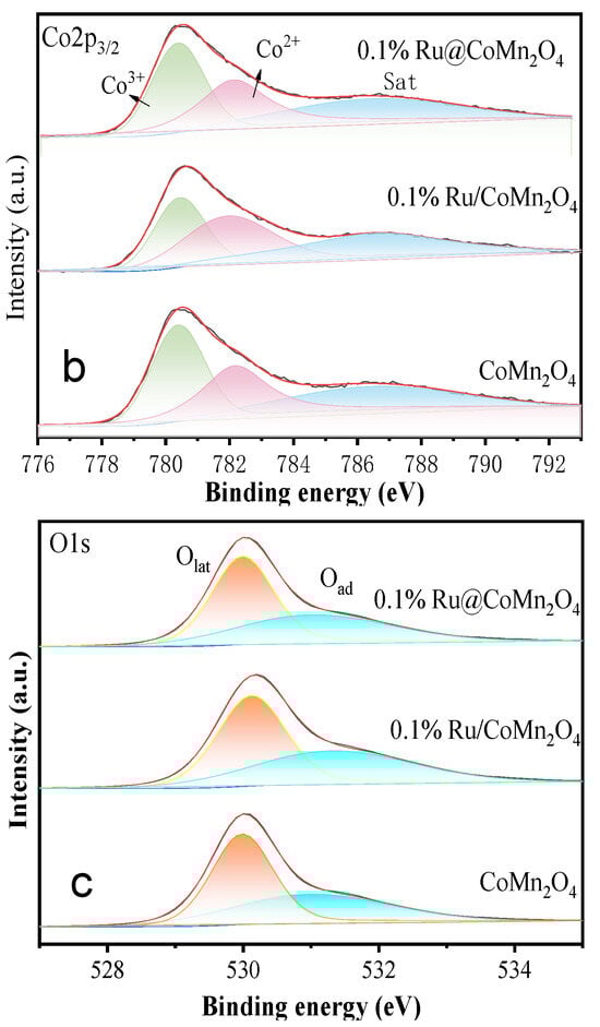 The O 1s spectrum could be divided into two types of oxygen: lattice oxygen (Olat) at 530.0 eV and chemisorbed oxygen (Oad) at 531.5 eV [47]. The results of the split-peak fitting of the two oxygen species (Figure 7c and Table 3) showed that the Olat/Oad ratios of CoMn2O4, 0.1%Ru/CoMn2O4, and 0.1%Ru@CoMn2O4 were 1.17, 1.27, and 1.36, respectively. Consistently with the previous conclusions of O2-TPD, it was regarded that the doping of Ru increased the amount of lattice oxygen. In addition, 0.1%Ru@CoMn2O4 possessed more lattice oxygen, not only loaded onto the spinel surface but also embedded in the crystal lattice.