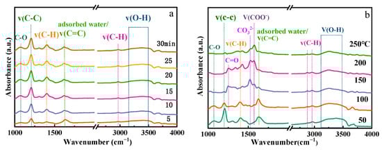 In situ DRIFTS was performed with Tensor 27 (Bruker, Ettlingen, Germany). First, degassing was carried out at 300 °C for 1 h by using N2 as the desorption gas. After cooling, 2000 ppm C3H8/N2 was introduced for adsorption (25 mL·min−1) till saturation to detect the process of propane adsorption. Then, C3H8 was cut off, and the temperature was increased at the heating rate of 5 °C/min to detect the changes in the surface species of the catalyst in N2 atmosphere. The temperature ranged from 50 to 250 °C, and each temperature point was kept for 0.5 h till stabilization. Infrared spectral data of the samples were acquired by accumulating 64 scans at a resolution of 8 nm−1. All of the data were subjected to background subtraction.