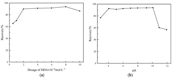 A series of flotation tests were conducted separately to investigate the effect of DDA dosage and slurry pH on the floatability of quartz. The pH was maintained at 10.1 while examining the effect of collector dosage, and the DDA dosage was set at 8 × 10−4 mol/L while investigating the impact of pH. The results are illustrated in Figure 1.