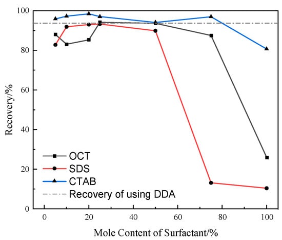 The influence of the molar content of surfactants on the recovery of quartz was investigated at a slurry pH of 10.1 and a combined collector concentration of 8 × 10−4 mol/L, and the results are shown in Figure 2.