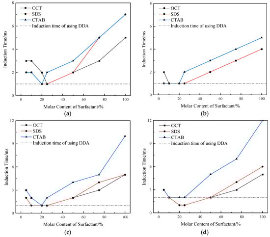 The influence of the molar content of surfactants in the combined collectors on the induction time was investigated at a slurry pH of 10.1 and a combined collector concentration of 8 × 10−4 mol/L, and the results are shown in Figure 3.