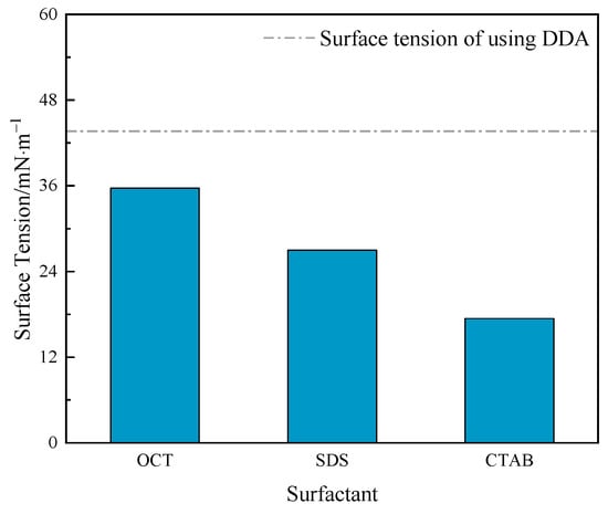 As shown in Figure 4, the surface tension of the combined reagent system is lower than that of the lonely DDA system. It indicates that the co-adsorption of the three surfactants with DDA at the gas/liquid interface has reduced the system’s surface tension. The order of decrease in the system’s surface tension is CTAB > SDS > OCT.